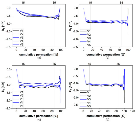 However, deviations from the assumed first-order permeation are more likely to occur during the early time points and in the plateau phase. Therefore, an average membrane permeation rate constant was calculated in a permeation range from 15–85%: