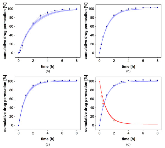 Comparison of observed and simulated permeation profiles at 0 (a), 25 (b), 50 (c), and 100 rpm (d). The blue squares indicate the mean ± SD (n = 6) observed cumulative drug permeation and the blue line presents the simulated cumulative drug permeation using the mean km ± SD. In (d) the donor compartment was evaluated. The red triangles indicate the observed mean ± SD (n = 6) with the corresponding simulated relative donor concentration as the red line.