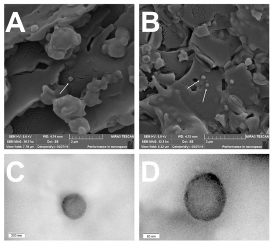 Figure 2 depicts the photomicrographies obtained by FESEM and TEM of the NC formulations. It was possible to observe particles with a well-defined spherical shape and a smooth and uniform surface by FESEM. TEM image (Figure 2C) confirmed the structure of shell-oily core nanocapsule. Figure 2D confirmed the smooth surface and the absence of pores. These results are consistent with the literature in which NCs were also prepared from PCL and by the chosen method [32,33,34,35,36,37,38]. In addition, no presence of drug crystal was reported on particle surface.
