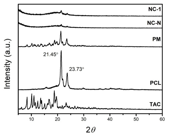 Considering the NC formulations, no drug crystallinity peak was seen, which indicates that TAC amorphization occurred during the interfacial deposition of preformed polymer method. In all formulations, the crystallinity peaks of PCL appeared.