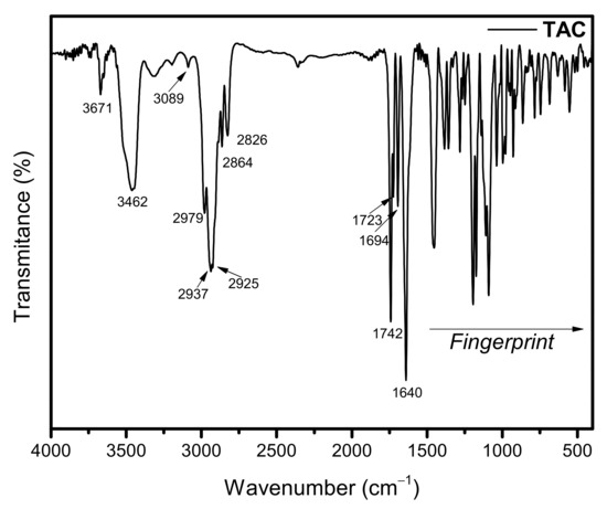 Figure 4 shows the FTIR spectrum of pure TAC, which showed a band of free OH stretch vibration at 3671 cm−1 and a band of OH in intermolecular hydrogen bond at 3462 cm−1. Stretch vibrations of sp2 hybridized carbon at 3089 cm−1 and of sp3 hybridized carbon at 2979, 2937, 2925, and 2864 cm−1 were also assigned. O–CH3 stretch vibration at 2826 cm−1, C=O stretch vibration of ester at 1742 cm−1, C=O stretch vibrations of ketone at 1723 and 1694 cm−1, and C=O/C=C stretch vibrations of amide at 1640 cm−1 were recorded. Other signals below 1500 cm−1 were due to the angular vibrations and the fingerprint of drug molecule. Signs similar to those assigned were also found in the literature [40,41,50,51,52].