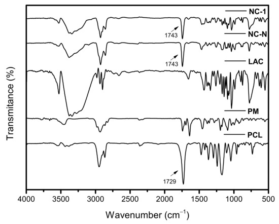 The other FTIR spectra of PCL, PM, LAC monohydrate, and non-loaded and TAC-loaded NCs are detailed in Figure 5. The FTIR spectrum of PCL showed typical bands of the polymer as stretch vibrations of sp3 hybridized carbon at 2948, 2899, and 2865 cm−1, C=O stretch vibration of ester at 1729 cm−1, angular vibrations of sp3 hybridized carbon at 1473 cm−1, C–O symmetric stretch vibrations at 1297 and 1241 cm−1, C–O asymmetric stretch at 1175 cm−1, and angular vibrations of sp3 hybridized carbon at 731 cm−1. The absorption bands attributed to the PM corresponded to the superposition of the FTIR spectra of the pure drug and the polymer without any change.