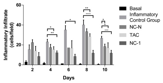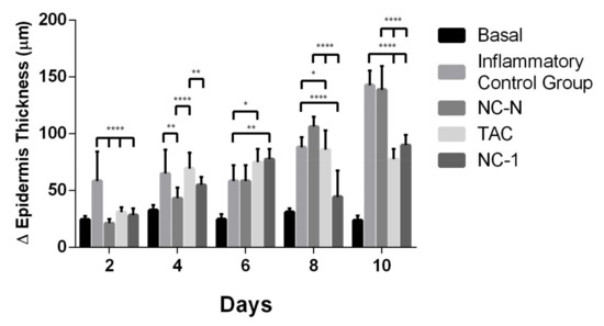 Regarding the inflammatory infiltrate (Figure 9), the migration of inflammatory cells to the ear dermal region in the groups that received TPA is indicative of the dermatitis induction. TAC and NC-1 significantly suppressed the cellular infiltration on days 4, 8, and 10 of treatment when compared with the inflammatory control group (ICG). NC-1 also revealed a significant statistical reduction in inflammation than ICG on day 6. Therefore, NC-1 has a relatively better performance than the free drug by providing an anti-inflammatory effect, possibly due to the controlled drug delivery.