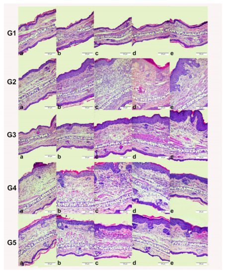 Effect of TAC, non-loaded, and TAC-loaded nanocapsules (NC-N and NC-1) on TPA-induced ear of male Balb/c mice. (G1) Basal group, (G2) inflammatory control group, (G3) NC-N group, (G4) TAC group, (G5) NC-1 group. (a) day 2, (b) day 4, (c) day 6, (d) day 8, and (e) day 10 of treatment. Images are representative of transverse sections of mice ears stained with hematoxylin and eosin (magnification: 200×; scale bar: 20 µm).