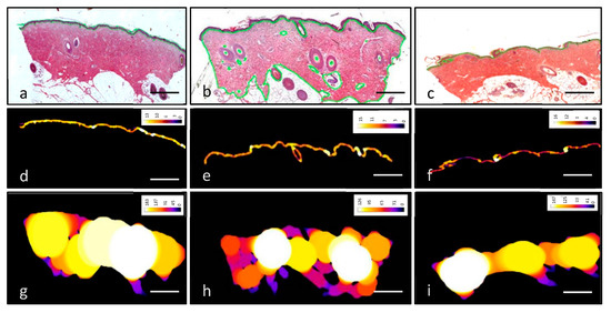 Method of measurement of epidermal and dermal thickness. Skin samples were stained with hematoxylin–eosin and prepared to be measured through the analysis software (a–c). Images were processed to quantify epidermal (d–f) and dermal (g–i) thickness by reducing the area to spheres. Colors in images d–i refer to the diameter of the spheres, which is depicted in the color legend in the upper-right-hand corner of each picture, measured in µm. Scale bar 1 mm.