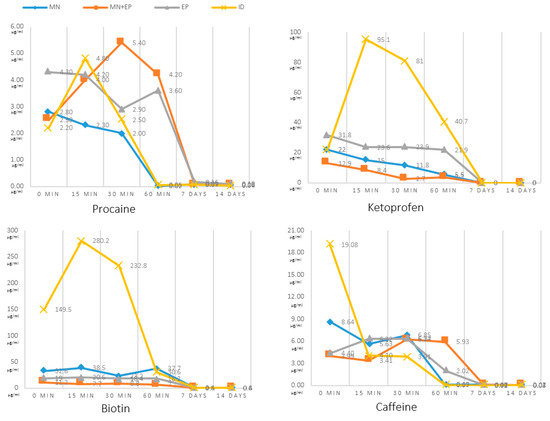 Biotin provided comparable results to ketoprofen, with an advantage for ID, showing the highest concentration after 15 min (Figure 6 and Figure 7). In this way, ketoprofen doubled the area under the curve of the next-most-effective technique, the MN (Figure 8).