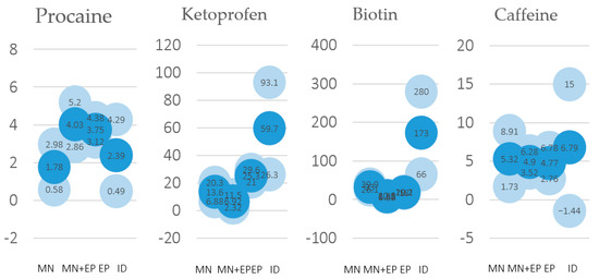 The performed experiments led to different results regarding the studied molecules– ketoprofen and biotin achieved the best concentrations with intradermal injections, while delivery methods for obtaining procaine and caffeine maximum concentrations changed in basis of the lapsed time, demonstrating little advantage for the MN + EP technique in the case of procaine, and for ID in the case of caffeine (Figure 7). However, the area under the curve showed a small advantage for the MN technique in the case of caffeine (Figure 8).