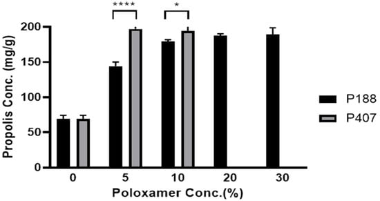 Effect of poloxamer type and concentration on the propolis solubility. Data are expressed as mean ± S.D. (n = 4). * p < 0.05, **** p < 0.0001 compared to the control, two-tailed student’s t-test.