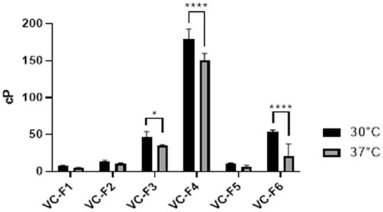 The viscosity of vehicle controls (VC) with varying poloxamer concentrations and types. VC represents vehicle controls of F1, F2, F5, and F6 without propolis. Data are presented as mean ± S.D. (n = 3). * p < 0.05, **** p < 0.0001 compared to the control, two-tailed student’s t-test.