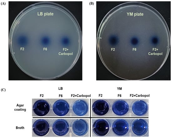 Diffusion of trypan blue was visualized on agar plates and Transwell inserts with and without agar-coating. Agar coating on Transwell inserts was prepared to mimic the diffusion in agar plates by hardening the agar solution used in the antimicrobial test to a thickness of 0.3 cm on the membrane of Transwell inserts (SPLInsert™, SPL Life Sciences Co., Ltd., Korea). Agar plates were spotted with 5μL of trypan blue-loaded F2, F6, and F2 + Carbopol formulations in Luria-Bertani (LB) and yeast malt (YM). Photographs were taken after standing for 18 h at 37 °C and 30 °C, respectively. For diffusion across the Transwell inserts, 100 μL of F2, F6, or F2 + Carbopol mixed with 900 μL of LB or YM were loaded on the inserts. Photographs were taken after 18 h for Transwell inserts with agar coating and after 2 h for Transwell inserts without agar coating.