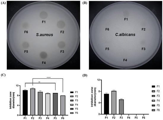 Representative agar plates from antimicrobial susceptibility test of (A) S. aureus and (B) C. albicans. The diameters of the zone of inhibition (clear zone around each well) were measured with a caliper in millimeters and expressed as mean ± S.D. (n = 3) for (C) S. aureus and (D) C. albicans. ** p < 0.01, **** p < 0.0001 compared to the control, two-tailed student’s t-test.