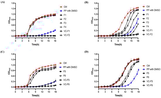 Time-kill kinetics of S. aureus (A,C), C. albicans (B,D) incubated with various formulations. VC-F1, VC-F2, VC-5, and VC-6 represent vehicle controls of F1, F2, F5, and F6 without propolis. Data are expressed as mean ± S.D. (n = 3).