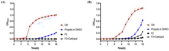 The antimicrobial activities of propolis incorporated in various poloxamer formulations were compared through the time-kill kinetics assay (Figure 6 and Figure 7). The control groups were the S. aureus and C. albicans suspended in broths without propolis or poloxamers. All P188 formulations showed better antibacterial activity than propolis dissolved in DMSO (Figure 6A). Propolis in 5% to 20% P188 completely inhibited bacterial growth for 18 h. On the other hand, their antifungal activity against C. albicans was observed up to 12 h, and the activity of propolis in 20% or 30% P188 was slightly better or worse than that of DMSO (Figure 6B). In contrast to the propolis formulation in P188, those in P407 showed worse antibacterial and antifungal effects than propolis dissolved in DMSO (Figure 6C,D). DMSO at this concentration did not affect the cells. In addition, vehicle controls of 5% and 10% P188 showed statistically significant inhibition against C. albicans compared to the control group (Supplement 4, Figure S4). A time-kill kinetics assay in the presence of Carbopol as a gelling agent showed that the antibacterial activity of 10% P188 formulation was not affected, but the antifungal activity was negatively affected by Carbopol (Figure 7).
