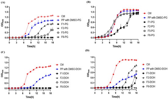 In order to evaluate the effect of poloxamers on another source of propolis, the time-kill kinetics of propolis extracted with ethanol were also performed in P188 and P407 solutions. Experimental details are described in Supplement 5. For this experiment, propolis concentration in each well was lowered to 625 μg/mL for meaningful comparison between propylene glycol- and ethanol extract. Even at this low concentration, both propylene glycol and ethanol-extracted propolis showed complete inhibition of S. aureus when formulated in P188 at 5% or 10% (F1-PG, F1-EtOH, F2-PG, and F2-EtOH in Figure 8A,C). P407 formulations of propylene glycol-extracted propolis (F5-PG and F6-PG) were not as good as P188 formulations but showed better activity than DMSO solution (Figure 8A), while those of ethanol-extracted propolis showed complete inhibition (Figure 8C). All these formulations showed better activity against C. albicans compared to DMSO solutions and P188 was more effective than P407 in improving the activity of both propylene glycol and ethanol-extracted propolis.