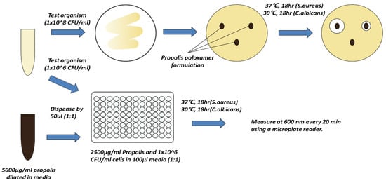 Taken together, the faster release rate of propolis from P188 formulation resulted in better antimicrobial activity compared to P407 formulation, which had a higher viscosity than P188. Furthermore, the micelle structures appeared to affect the activity of propolis formulated in poloxamers. The study results suggest that solubility enhancement alone cannot achieve an optimized formulation of poorly soluble compounds. Both poloxamer type and concentration were essential parameters to develop an effective antimicrobial formulation of propolis with antimicrobial activities against both bacteria and fungi. Further studies before clinical translation of the present results would include cytotoxicity tests in human cells and skin permeation tests. In addition, activity against other pathogenic microorganisms is warranted to propose propolis in P188 formulation as a potential antimicrobial agent.