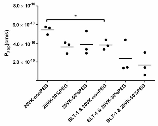 Permeability coefficients of vitamin K (350 μM) loaded in mixed micelles (non-PEG, 30%-PEG and 50%-PEG with the lipid concentration of 1.58 mM) in differentiated Caco-2 cells with and without pre-incubation with 10 μM BLT-1, shown as mean of triplicates for each group (two-tail unpaired t-test, * p ˂ 0.05).