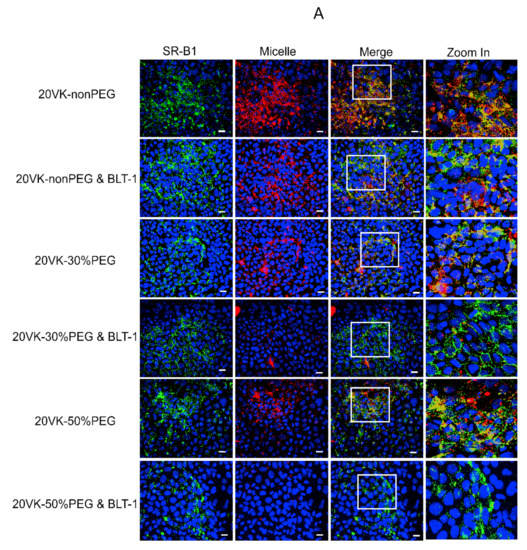 The binding to and uptake of mixed micelles by transfected Hela cells were imaged by confocal microscope. Hela cells were seeded in a 96-well plate at a density of 10,000 per well and incubated overnight at 37 °C. The cells were transfected with a plasmid containing SR-B1 cDNA with C-terminal GFP tag using Lipofectamine 3000 according to the protocol provided by the manufacturer. In short, 20 µL of the lipofectamine/cDNA dispersion containing 0.1 µg cDNA, 0.9 µL lipofectamine 3000 and 0.2 µL P3000 reagent was added to each well and incubated for 48 h at 37 °C, to obtain transfected Hela cells. The medium is described in Section 2.3. The transfected Hela cells were incubated with 200 µL rhodamine-labeled non-PEGylated, 30%-PEGylated or 50%-PEGylated mixed micelles (lipid concentration was fixed at 1.58 mM) with or without vitamin K (350 µM) at either 4 or 37 °C for 2 h in blank DMEM, respectively. Next, the medium was removed and the cells were washed 3 times with PBS. Subsequently, the cells were fixed with 4% paraformaldehyde for 10 min at room temperature, permeabilized with 0.05% saponin for 2 min, and then washed with PBS 3 times. The cells were finally incubated with Fluoroshield™ solution containing DAPI for nucleus staining. Images were acquired using a confocal microscope as described in Section 2.5. The expression of SR-B1 by the transfected Hela cells was also measured by immunofluorescence staining, as described in Section 2.5. Briefly, the cells were fixed with 4% paraformaldehyde and permeabilized with 0.05% saponin. Next, the cells were incubated with a primary antibody against SR-B1 and Alexa 555-labeled goat anti-mouse IgG and then exposed to the Fluoroshield™ solution containing DAPI. Images were acquired as described in Section 2.5.
