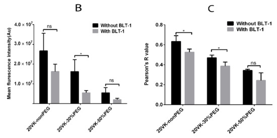 BLT-1 is a synthetic inhibitor of SR-B1 [36], of which its thiosemicarbazone moiety binds to the free thiol of cysteine 384 in the extracellular domain of the receptor [37], which is important for its structural integrity and function. Cellular uptake of rhodamine-labeled micelles decreased substantially after pre-incubation of the Caco-2 cells with BLT-1 (Figure 2A, the 2nd, 4th and 6th row), i.e., by 37 ± 12%, 64 ± 9% and 55 ± 21% (Figure 2B). Pearson’s coefficients (R value) as a measure of the colocalization ratio of mixed micelles and SR-B1 are presented in Figure 2C. Inhibition of the receptor by BLT-1 was accompanied by a decrease in the Pearson’s coefficients (for non-PEGylated micelles from 0.63 ± 0.05 to 0.53 ± 0.03, 30%-PEGylated micelles from 0.47 ± 0.02 to 0.39 ± 0.03 and 50%-PEGylated micelles from 0.34 ± 0.01 to 0.24 ± 0.06), demonstrating that the uptake pathway of mixed micelles was blocked by inhibition of the scavenger receptor B1 with BLT-1. These data obtained through labeling of the micelles by fluorescence further confirm the role of SR-B1 in the uptake of vitamin-K-loaded mixed micelles, both with and without PEGylation, most likely through binding of intact micelles rather than released vitamin K.