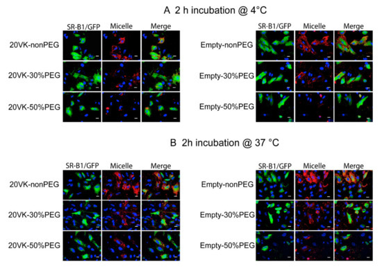 Representative confocal microscopic images of Hela cells overexpressing SR-B1/GFP (green) upon incubation at 4 (A) and 37 °C (B) with mixed micelles (from top to bottom: non-PEG, 30%-PEG, and 50%-PEG, with the lipid concentration of 1.58 mM) without (empty) and with vitamin K (350 μM). Micelles were labeled with rhodamine (red); scale bar is 20 µm.