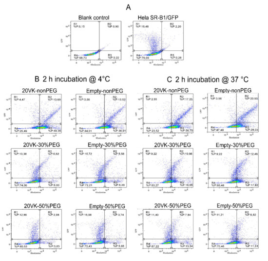 To investigate the cellular binding and internalization of mixed micelles, non-transfected and transfected Hela cells were incubated with rhodamine-labeled micelles with and without vitamin K loading at 4 and 37 °C, respectively, and subsequently analyzed by FACS. The dot plots are divided into four regions: unstained cells are distributed in R4 (region 4), R1 includes cells that express SR-B1/GFP, R2 contains cells that show both SR-B1/GFP and micelles (rhodamine) fluorescence, and R3 contains cells that only show rhodamine fluorescence. Binding and uptake of rhodamine-labeled micelles was detected as a right shift of the population on the X axis. For non-transfected Hela cells that do not show SR-B1/GFP fluorescence, the population partly shifts from R4 to R3 (Figure S5B,C). From the normalized median fluorescence shown in Figure S4D, it is noted that rhodamine fluorescence decreased with increasing PEG density upon incubation of non-transfected Hela cells with non, 30% and 50% PEGylated mixed micelles with and without vitamin K at both 4 and 37 °C, indicating reduced binding and uptake, respectively.