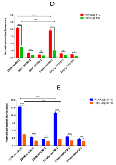 FACS analysis of Hela cells showing SR-B1/GFP fluorescence (Y-axis) and rhodamine fluorescence (X-axis): (A) non-transfected (left) and transfected (right) Hela cells not exposed to mixed micelles; (B,C) incubation of transfected cells, with from top to bottom: non-PEGylated, 30%-PEGylated and 50%-PEGylated mixed micelles (1.58 mM lipid) labeled with rhodamine, without (empty) or with vitamin K loading (350 μM) at 4 °C (B), and at 37 °C (C). R1 + R2: Hela cells with SR-B1/GFP signal, R3 + R4: Hela cells without SR-B1/GFP signal; (D,E) quantification of corresponding fluorescence of rhodamine for transfected HeLa cells incubated with micellar formulations, data shown as mean ± SD, n = 3. The quantified fluorescence intensity was normalized for the intensity from 20VK-50PEG micelles in cells without SR-B1/GFP. (Two-way ANOVA, **** p ˂ 0.0001, *** p ˂ 0.001, ** p ˂ 0.01, * p ˂ 0.05, ns is not significant).