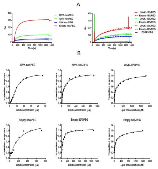 Figure 5A (left) shows the SPR response after binding of non-PEGylated micelles at a fixed lipid concentration of 36 µM and different vitamin K loadings to the immobilized SR-B1 protein. This figure shows that the SPR signal increases 10-fold, when vitamin K loading increases from 2 to 8 μM (corresponding to 5VK-nonPEG and 20VK-nonPEG). The dissociation constant of micelles with the highest vitamin K loading (KD of 9.2 ± 0.1 μM) is 17-fold lower than that of the corresponding empty micelles (KD of 159 ± 19 μM) (Table 2).