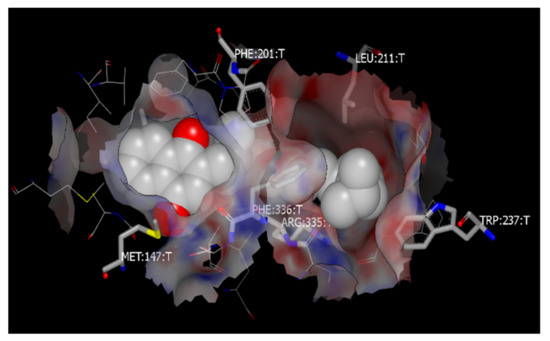 A selected low energy docking pose of vitamin K (White) with SR-B1, where numerous lipophilic residues are present to interact with vitamin K, similarly to the native ligand cholesterol.