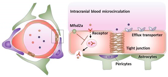 The blood–brain barrier (BBB) plays a crucial protective role in maintaining a highly precise brain microenvironment for neuronal activity by regulating material transport into and out of the brain. The structural bases of the BBB (Figure 1) are brain capillary endothelial cells with tight junctions, active efflux transporters, and major facilitator superfamily domain-containing protein 2a (Mfsd2a), which jointly endow the BBB with extremely low both paracellular permeability and transcellular permeability [1]. Tight junctions seal endothelial paracellular gaps, leading to high trans-endothelial electrical resistance and limited paracellular transport. Transmembrane tight junction proteins include claudins, occludin, and junctional adhesion molecules, which all attach to intracellular actin cytoskeleton by membrane-associated proteins (e.g., zonula occludins-1). Highly expressed active efflux transporters include P-glycoprotein (Pgp), breast cancer resistant protein (BCRP), and multidrug-resistance proteins (MRPs). Mfsd2a mediates unique BBB endothelial lipid composition via transporting lysophosphatidylcholine esterified docosahexaenoic acid to BBB endothelial cells, to limit formation of caveolae-mediated transcytotic vesicles [2,3,4]. In addition, endothelial cells, pericytes, and astrocytes jointly form the neurovascular unit (Figure 1), and regulate the development and function of the BBB microcirculation by interacting with each other via secreting several factors [5,6,7]. These above properties cause the BBB to be constantly and dynamically modulated by both physiological and pathological factors [8,9].