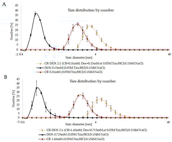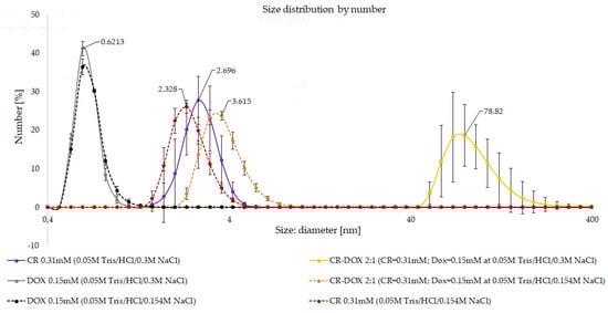 For DLS analysis of the effect of concentration on the hydrodynamic diameters of the analyzed probes, different concentrations were used. The final concentrations of higher concentration probes were: CR (1.43 mM), Dox (0.715 mM), and CR:Dox (molar ratio = 2:1, CR = 1.43 mM, Dox = 0.715 mM). All probes were dissolved in 0.05 M Tris/HCl. pH 7.4 buffer with 0.154 M NaCl.