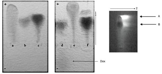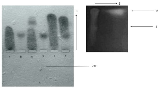 The possibility of creating complexes between Lλ and CR-Dox (2:1 molar ratio) was analyzed—replica on filter paper applied to bromophenol blue stained gel (after agarose gel electrophoresis at pH 8.6); migration towards the anode (+): (a) CR, (b) Lλ, (c) Lλ-CR complex, (d) Lλ-Dox mixture (Dox can be seen as migrating towards the cathode (−), pointed by arrow), (e) CR-Dox (molar ratio 2:1), (f) Lλ-CR-Dox (CR-Dox molar ratio 2:1); The absence of Dox in the Lλ-CR-Dox mixture was confirmed chromatographically. Arrow (A) points to Dox eluted from CR-Dox complex (fastest migration), arrow (B) points to the position of Lλ−CR complex (where Dox is absent).