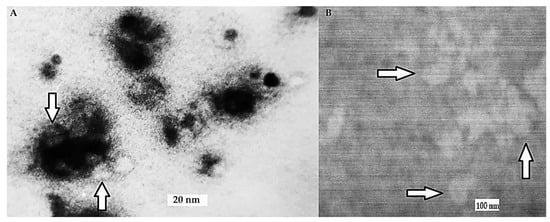 Complexes observed using TEM. (A). Heat aggregated immunoglobulins (HAI) with CR; (B). HAI without CR. Clusters of supramolecular Congo red can be distinguished around antibodies (darker spots). The images of immunoglobulins (brighter spots) are indicated by arrows.