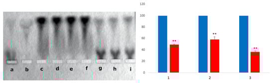 A loss of the CR-RhoB complex initially bound to albumin was observed after the addition of HAI in the amount of respectively: 50.6% in the case of the initially added CR:RhoB at molar ratio of 1:1 (compare “d” with “g” on the electrophoresis slab and with (1) on the histogram); 41.7% (for 2:1; compare “e” with „h” on the electrophoresis slab and (2) on the histogram) and 63.3% (for 5:1; compare “f” with “i” on the electrophoresis slab and (3) on the histogram). Complex binding to HAI is visible. The data in the graphs compare controls (blues bars) with results (red bars) and represent the mean ± SEM; test Student T. * p < 0.05, ** p < 0.01, *** p <0.001.