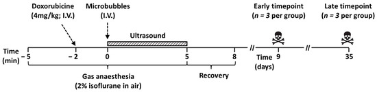 Timeline of the experimental setup. Mice were anesthetised five minutes prior to the ultrasound treatment. Doxorubicin was injected two minutes prior to the ultrasound treatment, and the microbubbles were injected immediately before ultrasound application, which lasted for five minutes. Mice were kept in a UV-heated chamber for recovery for approximately three minutes. Mice were sacrificed after 9 or 35 days.