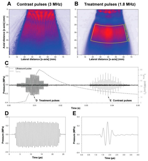 Ultrasound was generated by a C1-5 transducer connected to an E9 clinical diagnostic ultrasound system with a research software package (supplied by GE Global Research, Niskayuna, NY, USA). The research package extends the ability to control the transmit frequency and pulse lengths and to interleave them with diagnostic imaging pulses. This is achieved via duplex imaging enabling a contrast imaging/colour doppler imaging configuration where the colour doppler pulses are replaced with long “treatment” pulses. The contrast image used a centre frequency of 3.0 MHz and 3 cycles in phase inversion/amplitude modulation configuration. The treatment pulse was set at 20 µs and had a centre frequency of 1.8 MHz. The beam density was set to high, and the packet size was set to 12. The ultrasound field was calibrated in a custom-made, motorised, 3-axis water tank using a 200-µm needle hydrophone kit (NH0200, Precision Acoustics Ltd., Dorchester, UK) using a traditional snake raster with a 500-µm step size in both axes. Following calibration in a water tank, the ultrasound transmission settings were set to achieve a peak-negative pressure of 0.25 MPa without attenuation. The attenuation of the mouse skin at 2.25 MHz was 5.19 dB/cm [21]. The mouse skin was approximately 0.200 cm thick, resulting in an attenuation of 1.04 dB (11.3% ultrasound loss) [22]. Hence, an attenuation of 11.3% was used when calculating the acoustic output. This resulted in an in situ pressure of 0.222 MPa, i.e., a Mechanical Index (MI) of 0.165 for the 1.8 MHz treatment pulse and MI of 0.128 for the 3.0-MHz contrast mode pulse, resulting in an on-screen Thermal Index for soft tissues (TIs) of 0.2 when combined. The spatial peak, temporal average intensity of the entire pulse train was 16 mW/cm2. The sector width of the image (i.e., active portion of the ultrasound transducer) was adjusted to ensure only the portion in contact with the mouse was active to minimise the acoustic field distortion from the areas of no tissue. The largest transmit beam aperture was less than 1.0 cm; hence, even if only a part of the transducer was in contact with the animal, an effective acoustic deposition was expected. An interpolated, attenuation-free, 2D hydrophone scan representation of the acoustic fields generated for the contrast and treatment pulses can be seen in Figure 2A,B, respectively. These images were reconstructed in MATLAB 2018a (MathWorks, Natick, MA, USA) after deconvolving the received hydrophone signal with the calibrated hydrophone frequency response for each scan point. The acoustic components of the contrast and treatment pulses (Figure 2A,B) were separated by using a bandpass filter at 2.4 MHz. An example of the pressure waveform and interleave pattern can be seen in Figure 2C–E. The frame rate was maximised by reducing the imaging depth and the ROI reaching a value of 17 frames per second. The multiple pulses of various amplitudes (seen in Figure 2C) in the treatment and contrast pulse trains were due to the multiple acoustic beams generated by the beam scan pattern in a clinical diagnostic scanner, i.e., the low-amplitude pulses to the left and right of the pulse of maximum amplitude were from the ultrasound beams to the left and right (c.f., red lines in Figure 2A) of the ultrasound beam currently being measured.