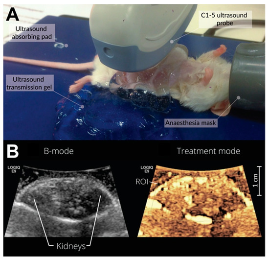 During ultrasound treatment, the mice were placed in the dorsal recumbent position on a heated, ultrasound transmission gel-covered ultrasound absorption pad. The surface temperature was set to 37 °C. The C1-5 curvilinear probe (GE Global Research, Niskayuna, NY, USA) was placed in a perpendicular position imaging both kidneys (Figure 3A). The ultrasound probe, the treatment region, was aligned using a B-mode ultrasound image (Figure 3B, left panel). During treatment, the system was switched to contrast imaging with Doppler. Hence, only the contrast image could be observed during treatment (Figure 3B, right panel). The ROI determined the focal position and the area where the 20-µs pulses (therapeutic pulses) were targeted toward (Figure 3B, right panel), i.e., the area where the ultrasound-enhanced therapy was expected. The mice were treated with ultrasound for a total of 5 min. After treatment, the anaesthesia was immediately turned off, and mice were placed in a UV-heated chamber for 3–5 min until awake and recovered.