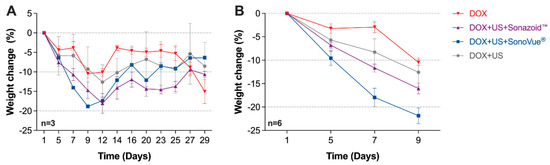Percentage of weight change after a single treatment on day 1. During the first 2 weeks, there were signs of increased toxicity with increased weight loss in the groups receiving DOX + US + microbubbles (A) (n = 3) for the whole study period and (B) (n = 6) until day 9. DOX = Doxorubicin; US = Ultrasound.