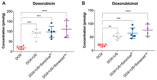 The measurements of doxorubicin/doxorubicinol concentrations in homogenised kidney tissue lysates (euthanasia day 9) showed substantially higher concentrations in the ultrasound treatment groups when compared to the control (DOX) group (Figure 5). Ultrasound alone significantly increased the uptake of doxorubicin from a mean of 18.9 pmol/g to 90.8 pmol/g (p = 0.0004). Several studies supported the increased uptake with just the application of ultrasound alone but not at such low acoustic pressures [33,34]. The addition of microbubbles further increased the uptake of doxorubicin up to 97.9 pmol/g for SonoVue® (p = 0.0001 vs. DOX) and 111.8 pmol/g for SonazoidTM (p < 0.0001 vs. DOX) (Figure 5A). There was no significant difference between DOX + US and either of the microbubble groups. Similar results were seen for doxorubicinol (Figure 5B). Ultrasound alone significantly increased the uptake of doxorubicinol into the kidney tissue from a mean of 19.3 pmol/g to 52.5 pmol/g (p = 0.0032). The addition of microbubbles further increased the uptake of doxorubicinol to 65.0 pmol/g for SonoVue® (p = 0.0001 vs. DOX) and 76.4 pmol/g for SonazoidTM (p < 0.0001 vs. DOX). There was no significant difference between DOX + US and the microbubble groups for the metabolite. After five weeks, the doxorubicin and doxorubicinol concentrations were below the detection limit.