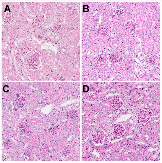 Kidney function was evaluated by measuring the serum creatinine with a Cobas c 111 apparatus (Roche Diagnostics, GmbH, Basel, Switzerland). Whilst a reference cut-off value for the presence of kidney damage has not been well-established, using this method for groupwise comparisons still stands. Higher concentrations of serum creatinine indicate a higher degree of kidney damage. For these serum analyses, we pooled the samples from 9 days and 35 days due to the small sample size.