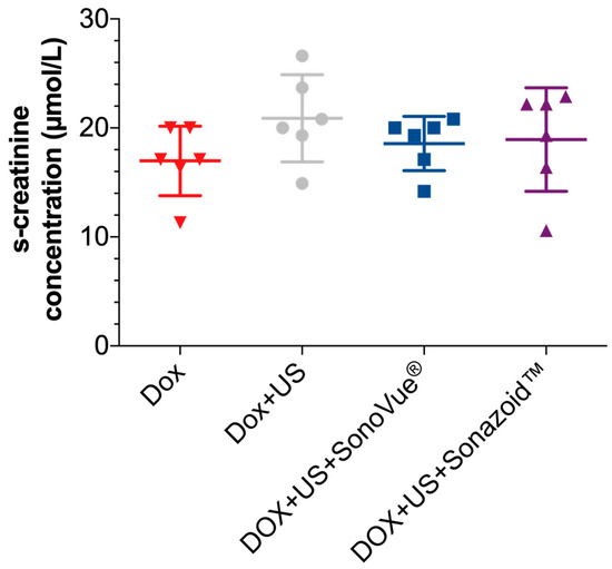 Serum creatinine is a marker with the ability to detect kidney damage [39]. Serum creatinine was measured for all the animals. A mean concentration (±SD) of 17.0 ± 3.2, 20.9 ± 4.0, 18.6 ± 2.5, and 18.9 ± 4.8 µMol/L was measured for the DOX, DOX + US, DOX + US + SonoVue®, and DOX + US + SonazoidTM groups, respectively (Figure 7). One-way ANOVA with Dunnett’s multiple comparisons test with multiplicity adjusted p-values did not detect any significant differences between the four groups. However, sonoporation did not alter the renal tissue structure and function as measured by histology or serum creatinine, respectively. Yet, a respective effect on the more sensitive analysis of kidney function—namely, the measured glomerular filtration rate—cannot be excluded. Interestingly, our results suggest that sonoporation could enhance the uptake of a cytotoxic drug with a known high distribution to kidney tissue in the first place.