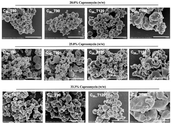 Both the drug content in the formulation and inlet temperature of spray drying can influence the production yield. When the temperature was low, drying was incomplete, leading to the adherence of droplets on the inner surfaces of the cyclone and hence low production yield [41,42,43]. In the C20, C25 and C33 groups, the production yield was the highest at the inlet temperature of 120 °C, above which the yield started to decline. In the C50 group, there was a high content of capreomycin, which is amorphous in nature with high surface adhesive property [44]. As a result, the particles, in general, were more likely to adhere to the cyclone of the spray dryer instead of depositing in the collector vial. The inlet temperature also influenced the residual moisture in the spray-dried powder. As expected, spray drying at low temperature (inlet temperature of 60 °C) produced particles with higher residual moisture than other groups. No clear trend was observed in the residual moisture between T90, T120, and T150 groups. The result suggested that an inlet temperature of 60 °C was insufficient for proper drying, which led to the low production yield and high residual moisture.