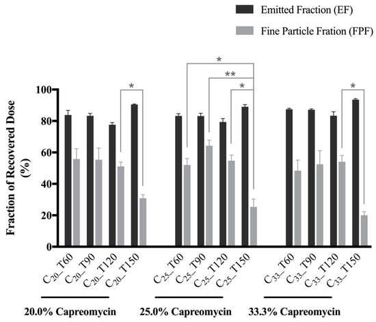 The morphology of particles produced by spray drying was mainly affected by temperature rather than the capreomycin content. Unlike the T60, T90 and T120 formulations, particles of the T150 group were irregular in shape with rough surfaces. This can be explained by the different crystallization process of mannitol at different temperatures [45,46]. When the temperature reached a certain level (e.g., at 150 °C in this study), solvent evaporated very rapidly. The high solvent evaporation rate with a low crystallization nucleation rate rendered the feed liquid to become highly concentrated and viscous. As a result, larger mannitol crystals with rough surfaces were formed [45,46]. In contrast, the particles of T60, T90 and T120 groups were spherical, which have a small area-to-volume ratio that facilitates powder dispersion by reducing aggregation [47]. The particle size distribution was a decisive factor of the deposition site following inhalation. It is widely accepted that particles with median aerodynamic diameters in the range of 1 to 5 μm can efficiently deposit in the lower airways [48]. Formulation C25_T90 had the smallest MMAD of 3.38 μm, indicating that this formulation is likely to achieve efficient lung deposition. The similar particle size between T60, T90 and T120 groups can be explained by the particle formation process [45,49,50]. During the drying process at lower inlet temperature (at 120 °C and below), the water evaporation rate was low, and the mannitol began to crystallize once it reached a critical concentration at the surface [45,49,50]. Therefore, the particles size was mainly determined by the droplet size. As the droplet size after atomization was similar between formulations with the same composition and spray drying parameters except for inlet temperature (which was not high enough to make any difference), the similar drying manner may produce particles with similar size [45,49,50]. In contrast, when the inlet temperature was high enough (at 150 °C or above), the solvent evaporated very rapidly, and the crystallization growth may be different due to supersaturation. The mannitol tended to crystallize with a secondary nucleation process, for instance, using other already crystalline particles in the spray dryer as seed, leading to a wide variation of particle size [45]. The particles in T150 groups with rough surface may also have different particle interaction compared to the smooth particles [45], hence affecting the resultant particle size.
