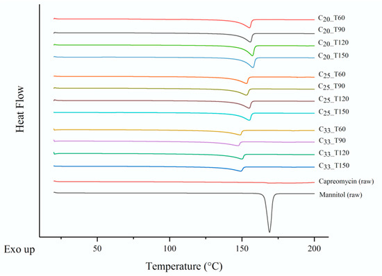 Differential scanning calorimetry (DSC) thermogram of spray-dried powders, raw capreomycin and raw mannitol. Negative peak represents endothermic events.