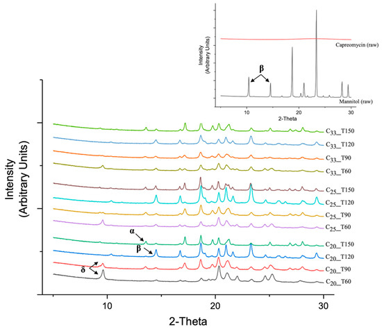 All investigated formulations demonstrated a characteristic endothermic peak at 150 to 160 °C in the DSC study (Figure 3), whereas raw mannitol was reported to have a melting point at 166 to 168 °C [26]. This observation demonstrated a shift in melting point of mannitol in the presence of capreomycin. The higher the content of capreomycin, the lower the temperature of the endothermic peak. Formulations with the same content of capreomycin showed similar thermal behavior regardless of the inlet temperature of spray drying. The smaller particles size of mannitol after spray drying may also cause melting point depression [27]. According to the PXRD results (Figure 4), raw mannitol was highly crystalline and predominately in the β form, as indicated by the peaks at 10.5° and 14.7°(indicated by arrows) [28]. Formulations in the T120 group were also predominately in the β form (14.7°, indicated by the arrow in C20 group) while those in the T150 group exhibited α and β polymorphs, since they had the characteristic peaks not only at 14.7° but also at 13.6° (indicated by the arrow in C20 group) [28]. Interestingly, compared to the diffractogram of pure δ forms of D-mannitol, the mannitol in T60 and T90 groups also contained the δ form (characteristic peak at 9.74° as the arrow indicated in C20 group) [28,29], which is thermodynamically less stable than the other two forms [29,30].