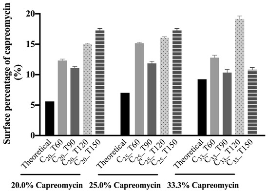 The elemental composition of raw mannitol and capreomycin sulfate by the number of atoms in the molecules (Table 4), and the molar surface capreomycin sulfate composition of the spray-dried powders (Figure 5) were calculated. The experimentally measured fraction of carbon was higher than the theoretical one for both capreomycin sulfate and mannitol, while those of oxygen and nitrogen (in capreomycin sulfate only) were lower. The measured surface proportion of sulfur in capreomycin sulfate was close to the theoretical value. The theoretical molar proportion of capreomycin sulfate in C20, C25 and C33 groups were 5.6%, 7.0%, and 9.3%, respectively. All spray-dried formulations displayed an enrichment of capreomycin on the surface of the particles. Among the formulations of the same drug content, those spray-dried at 90 °C had the lowest capreomycin sulfate surface coverage. Only formulations spray-dried at 120 °C showed a clear trend of increasing capreomycin sulfate surface coverage with the drug load, with C33_T120 exhibiting the highest content of capreomycin sulfate on the surface (19.2% w/w). No clear trend was observed for other inlet temperatures.