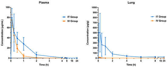 Pharmacokinetic study of spray-dried powder formulation of capreomycin on mice. The mice in intratracheal (IT) group were administered with capreomycin spray-dried powders (C25_T90 formulation) intratracheally with a dosage range of 17.5–22.5 mg/kg (the average delivered dose was 20.54 ± 1.31 mg/kg). The mice in intravenous (IV) group were administered with capreomycin solution intravenously at a dose of 20 mg/kg. Data was presented as mean ± standard deviation. (n = 5 for each time point).