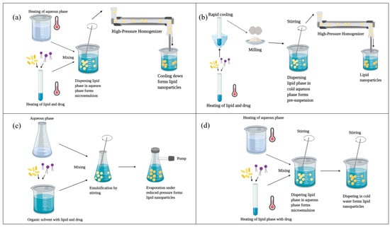 Visual representation of several conventional synthesis methods for LNP-based delivery systems. (a) hot high-pressure homogenization method; (b) cold high-pressure homogenization method; (c) solvent evaporation method; (d) microemulsion method. Adapted from [], published by Uppsala University, 2020.