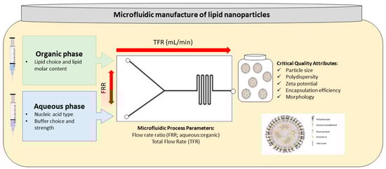 Schematic representation of LNP-based delivery systems manufacturing through microfluidic methods. Adapted from [], published by MDPI, 2020.