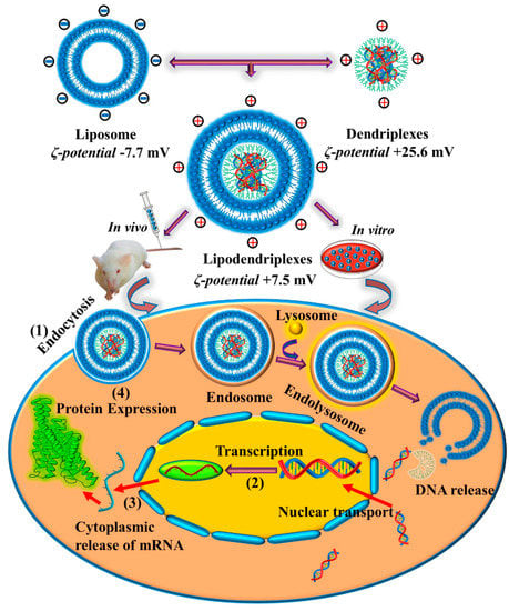 Schematic representation of lipodendriplexes formation and cellular internalization. (1) Endocytosis and pDNA release into the cytoplasm. (2) Transcription of gene-encoded DNA into mRNA. (3) mRNA export from the nucleus to the cytoplasm. (4) Protein expression. Adapted from [], published by Nature, 2020.
