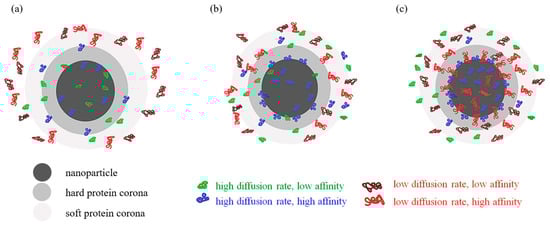 (a) Initiation of formation of protein corona (PC) (seconds after the NP reaches the biological fluid); (b) beginning of exchange from the PC of proteins with low affinity with proteins that have higher affinity (seconds to minutes); (c) stabilized PC, with proteins with high affinity occupying the first layer of PC (hard PC) and the majority of the second layer (soft PC) where proteins with low affinity are still present. Adapted from [], published by MDPI, 2020.