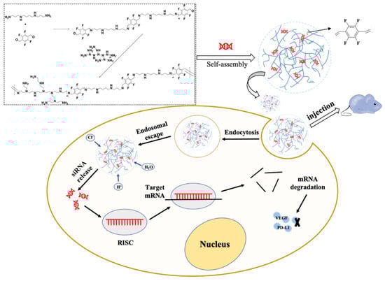 In this study, 2,3,5,6-tetrafluoroterephthaldehyde was selected to react with PEI 1.8 kDa and spermine, and fluorinated modification was performed by forming imine bonds. The novel fluorinated carrier was used to deliver corresponding siRNA to mediate silencing of the expression of VEGF and PD-L1, effectively restoring the anti-tumor function of T cells and inhibiting tumor angiogenesis through multiple signal pathways. Subsequently, the physicochemical properties of the polyplex were characterized. Anti-PD-1/PD-L1 immune checkpoint blocking therapies have been extensively studied in breast cancer, non-small cell lung cancer, and colorectal cancer [47]. Among them, colorectal cancer has become the third most prevalent tumor and an important factor in the high cancer mortality rate. Therefore, CT26 colorectal cancer cells were taken as the representative cell line to provide a basis for the therapeutic effect of our drug delivery system on tumors. The cytotoxicity and silencing efficiency of the polyplex were investigated in vitro on CT26 cells with high expression of VEGF and PD-L1. Lastly, a tumor-bearing mouse model was established to evaluate the tumor-suppressive effect and toxicity of the gene delivery system (Figure 1).